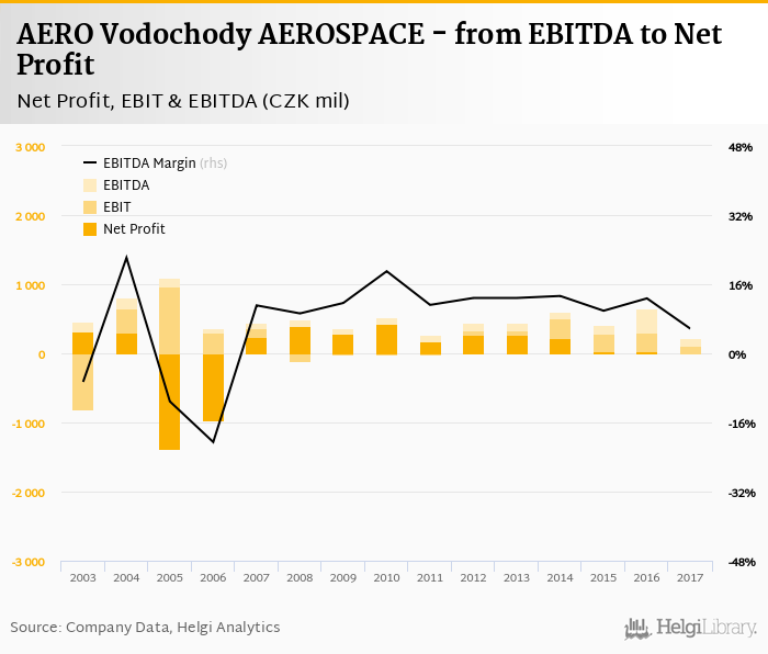 AERO Vodochody AEROSPACE made a net profit of CZK -5.90 mil with revenues of CZK 3,789 mil in 2017, down by 115% and down by 25.7%, respectively, compared to the previous year. This translates into a net margin of -0.156%.