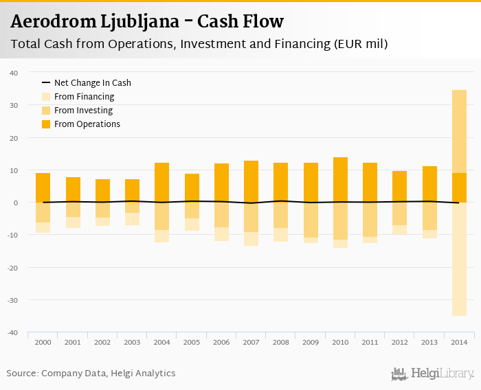 At the end of 2014, the company had a net debt of EUR -0.063 mil, or -0.006x of EBITDA and < -0.001 of equity. Net working capital amounted to EUR 2.43 mil, or 7.58% of sales. The cash conversion cycle stood at -27.4 days in 2014. This is an improvement compared to the previous year (-42.0 days), so Aerodrom Ljubljana’s working capital was tied up for 14.6 fewer days.