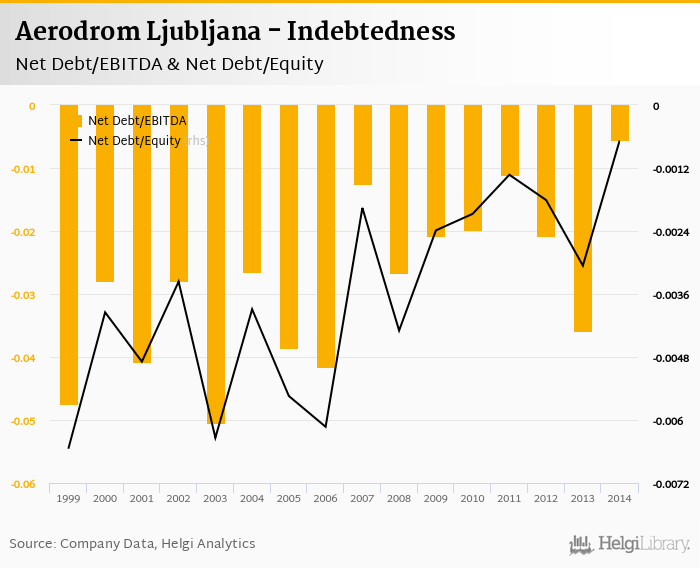 Aerodrom Ljubljana's net debt stood at EUR -0.063 mil and accounted for < -0.001 of equity at the end of 2014. The ratio is up 0.002 pp compared to the previous year.