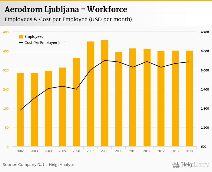 Aerodrom Ljubljana employed 402 employees in 2014, up 0% compared to the previous year. Historically, between 2002 and 2014, the firm's workforce hit a high of 446 employees in 2008 and a low of 307 employees in 2003.