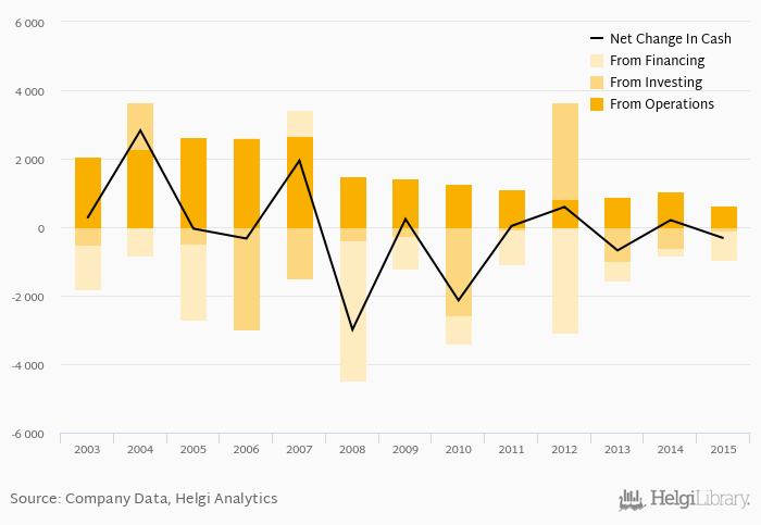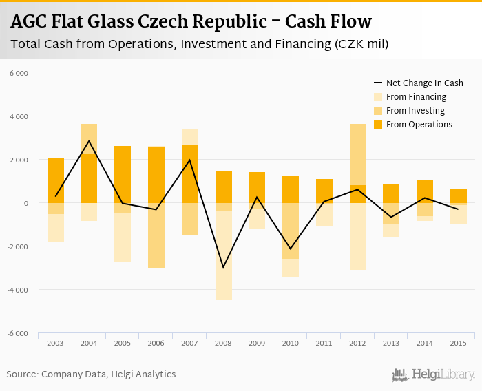AGC Flat Glass Czech Republic's operating cash flow stood at CZK 643 mil in 2015, down 38.1% when compared to the previous year. Historically, between 2003 - 2015, the firm’s operating cash flow reached a high of CZK 2,657 mil in 2007 and a low of CZK 643 mil in 2015.