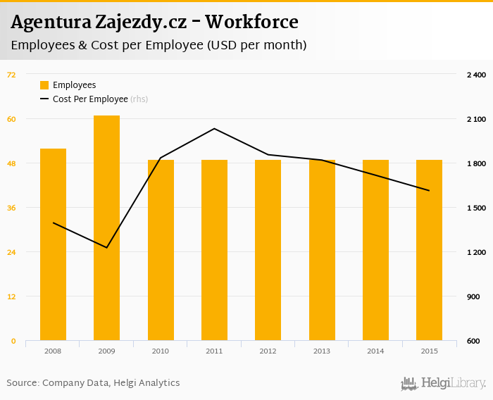 Agentura Zajezdy.cz employed 49.0 employees in 2015, up 0% compared to the previous year. Historically, between 2008 and 2015, the firm's workforce hit a high of 61.0 employees in 2009 and a low of 49.0 employees in 2010.