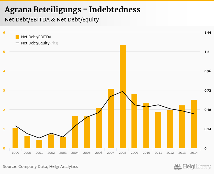 Agrana Beteiligungs's net debt stood at EUR 507 mil and accounted for 0.425 of equity at the end of 2014. The ratio is down 0.037 pp compared to the previous year.