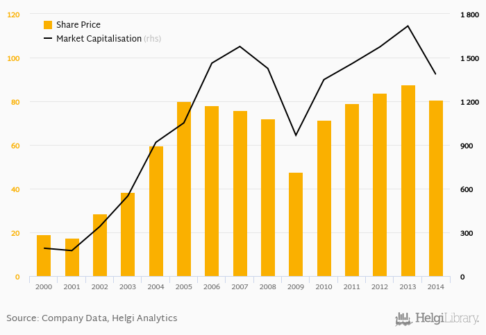 Historically, between 2000 and 2014, the Agrana Beteiligungs’s stock price reached a high of EUR 87.7 in 2013 and a low of EUR 17.3 in 2001.