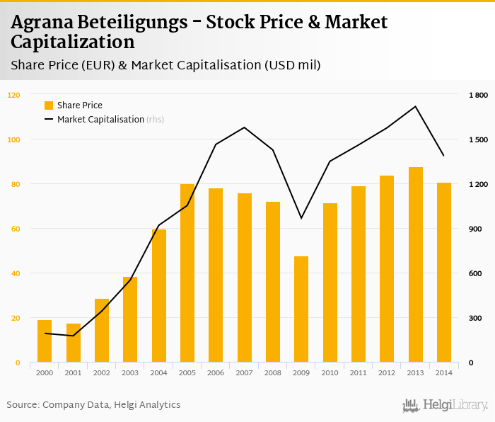 Agrana Beteiligungs stock traded at EUR 80.5 per share at the end 2014 implying a market capitalization of USD 1,384 mil.