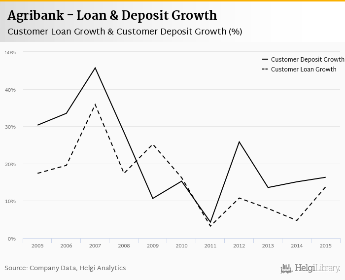 Agribank's customer loan growth reached 13.8% in 2015, up from 4.74% compared to the previous year. Historically, the bank’s loans growth reached an all time high of 35.8% in 2007 and an all time low of 3.22% in 2011. In the last decade, the average annual loan growth amounted to 15.1%.