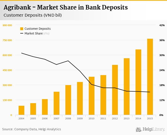 Agribank accounted for 15.1% of all customer deposits taken by banks in Vietnam at the end of 2015. Historically, the bank’s market share in customer deposits reached an all time high of 30.7% in 2004 and an all time low of 15.1% in 2015.