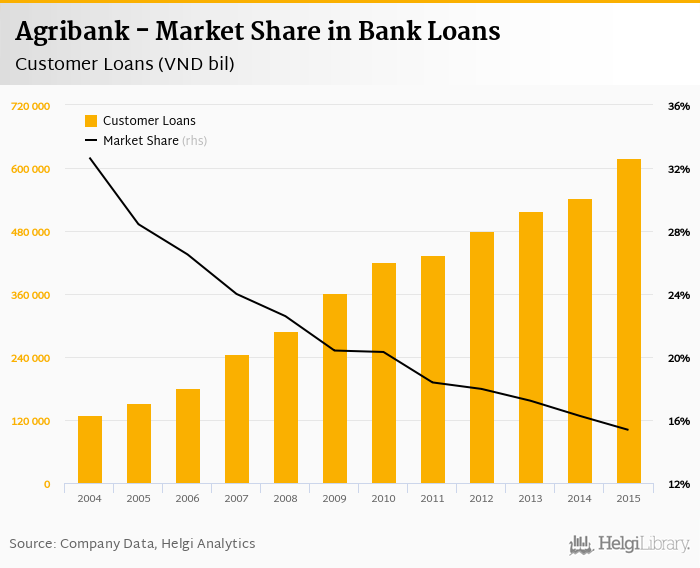 Agribank accounted for 15.4% of all customer loans issued in Vietnam at the end of 2015. Historically, the bank’s market share in customer loans reached an all time high of 32.7% in 2004 and an all time low of 15.4% in 2015.