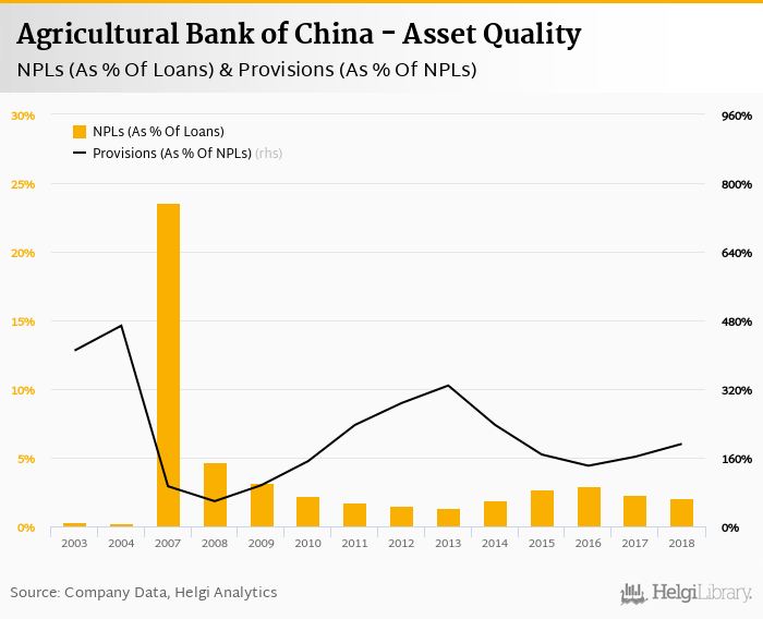 Agricultural Bank of China's non-performing loans reached 2.09% of total loans at the end of 2018, down from 2.32% compared to the previous year. Historically, the NPL ratio hit an all time high of 23.6% in 2007 and an all time low of 0.267% in 2004.