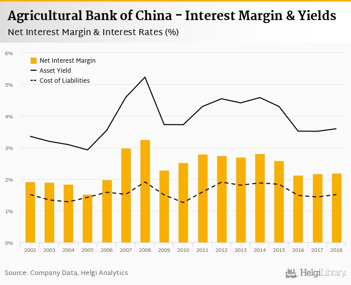Agricultural Bank of China's net interest margin amounted to 2.19% in 2018, up from 2.18% compared to the previous year.