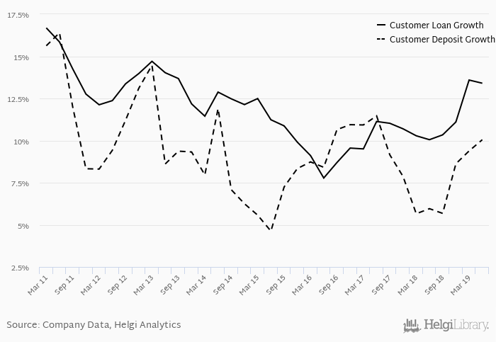 On the other hand, bank's customer deposit growth amounted to 10.1% at the end of 2019-06-30, up from 5.96% when compared to the previous year. Historically, the bank’s deposit growth reached an all time high of 16.4% in 2011-06-30 and an all time low of 4.63% in 2015-06-30. In the last decade, the average annual loan growth amounted to 0%.