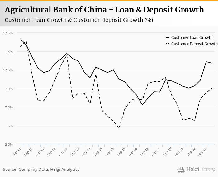 Agricultural Bank of China's customer loan growth reached 13.4% in 2019-06-30, up from 10.1% compared to the previous year. Historically, the bank’s loans growth reached an all time high of 16.7% in 2011-03-31 and an all time low of 7.78% in 2016-06-30. In the last decade, the average annual loan growth amounted to 0%.