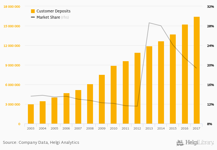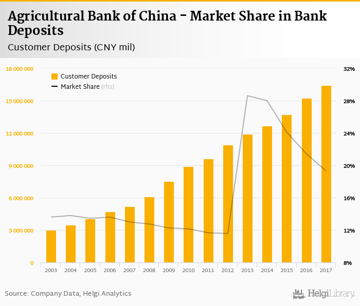 Agricultural Bank of China accounted for 19.3% of all customer deposits taken by banks in China at the end of 2017. Historically, the bank’s market share in customer deposits reached an all time high of 28.6% in 2013 and an all time low of 11.6% in 2012.