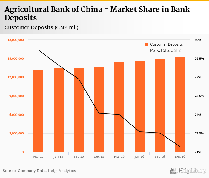 Agricultural Bank of China accounted for 21.4% of all customer deposits taken by banks in China at the end of 2016-12-31. Historically, the bank’s market share in customer deposits reached an all time high of 29.2% in 2015-03-31 and an all time low of 21.4% in 2016-12-31.