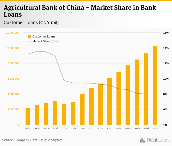 Agricultural Bank of China's customer loans reached CNY 10,316,300 mil in 2017, up 10.7% compared to the previous year.