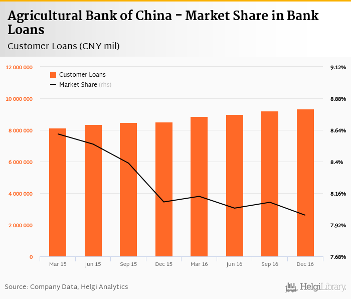 Agricultural Bank of China accounted for 7.99% of all customer loans issued in China at the end of 2016-12-31. Historically, the bank’s market share in customer loans reached an all time high of 8.61% in 2015-03-31 and an all time low of 7.99% in 2016-12-31.