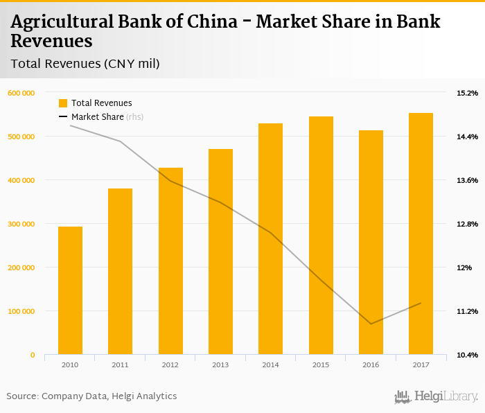 As a result, Agricultural Bank of China accounted for 11.3% of all bank revenues generated by banks in China in 2017. Historically, the bank’s market share in total revenues reached an all time high of 14.6% in 2010 and an all time low of 11.0% in 2016.