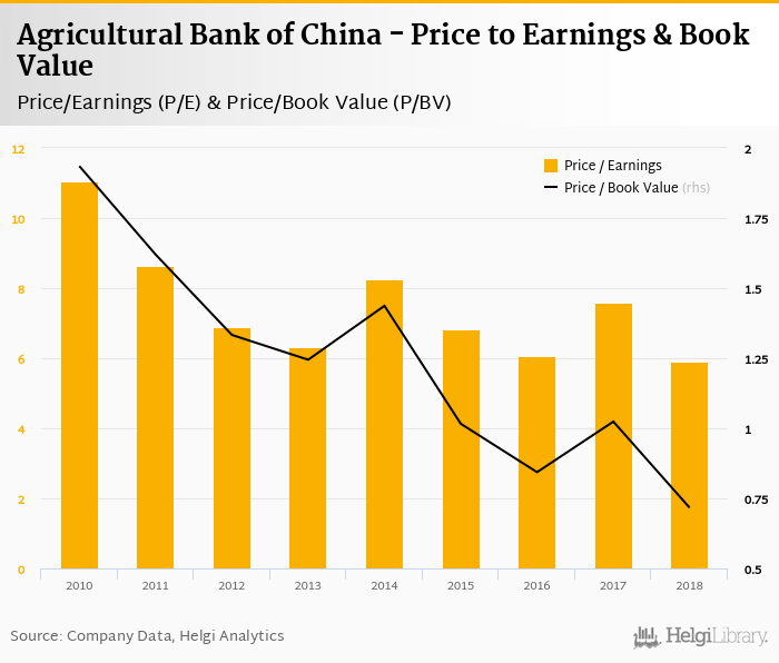 Agricultural Bank of China stock traded at HKD 3.01 per share at the end 2018 implying a market capitalization of USD 134,649 mil.