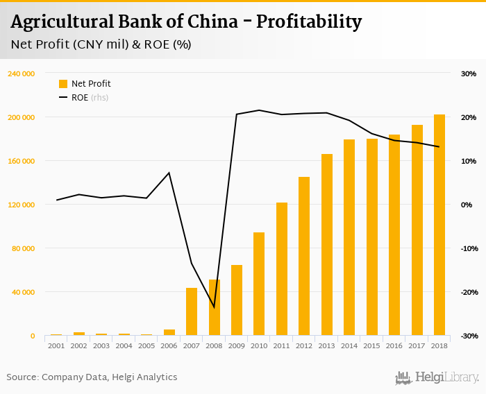 Agricultural Bank of China made a net profit of CNY 202,783 mil in 2018, up 5.09% compared to the previous year. This implies a return on equity of 13.1%.