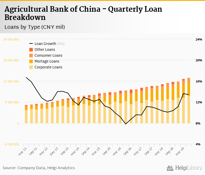At the end of second quarter of 2019, Agricultural Bank of China's loans accounted for 65.4% of total deposits and 52.0% of total assets.