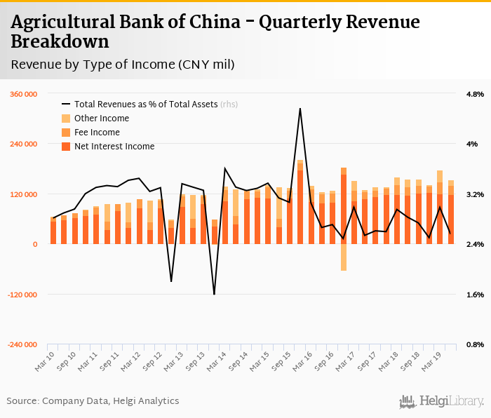 Agricultural Bank of China generated total banking revenues of CNY 152,803 mil in the second quarter of 2019, down 1.17% when compared to the same period of last year and 13.2% when compared to the previous quarter.