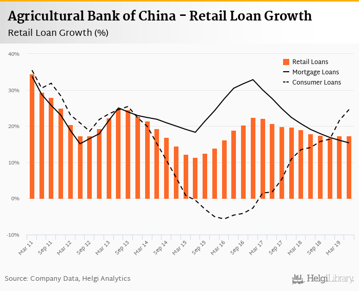 Agricultural Bank of China's retail loans reached CNY 5,102,400 mil at the end of 2019-06-30, up 3.85% compared to the previous year. In the last decade, the average annual loan growth amounted to 0%.