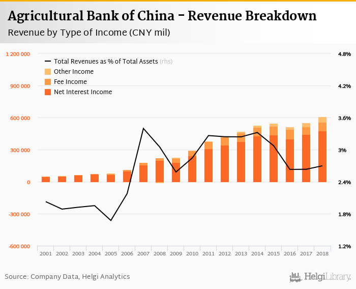 Comparing Agricultural Bank of China with its closest peers, Home Credit China generated total revenues of 19.9% of assets in 2018, Qudian operated with 30.5% revenue margin and Lexin FinTech produced total income worth 34.1% of assets.