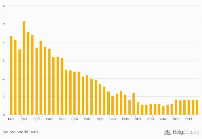 Historically, value added of agriculture as a share of GDP in Puerto Rico reached an all time high of 5.15% in 1974 and an all time low of 0.481% in 2007.