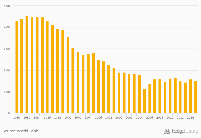 Value added of agriculture as a share of GDP fell 3.87% to 1.52% in Sweden in 2015, according to Faostat.