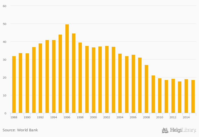 | Kyrgyzstan | % | 21.1% | 19.4% | 18.6% | 19.2% | 17.7% | ||||||||||||||||