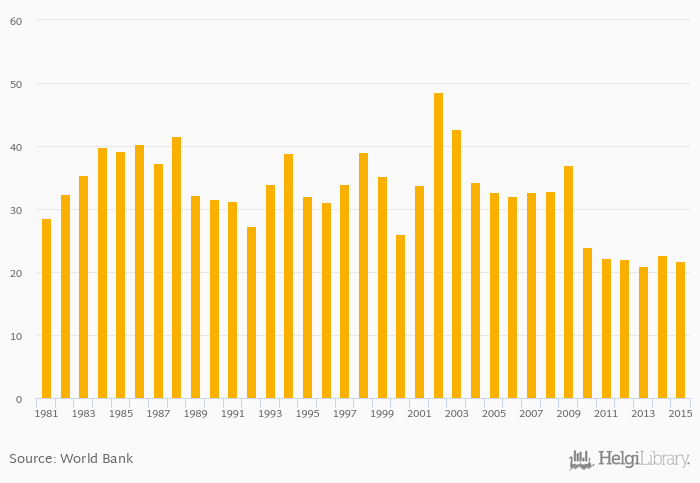 Historically, value added of agriculture as a share of GDP in Nigeria reached an all time high of 48.6% in 2002 and an all time low of 21.0% in 2013. When compared to Nigeria's main peers, value added of agriculture as a share of GDP in Benin amounted to 36.5%, 23.2% in Cameroon, 53.5% in Chad and 38.3% in Niger in 2015.