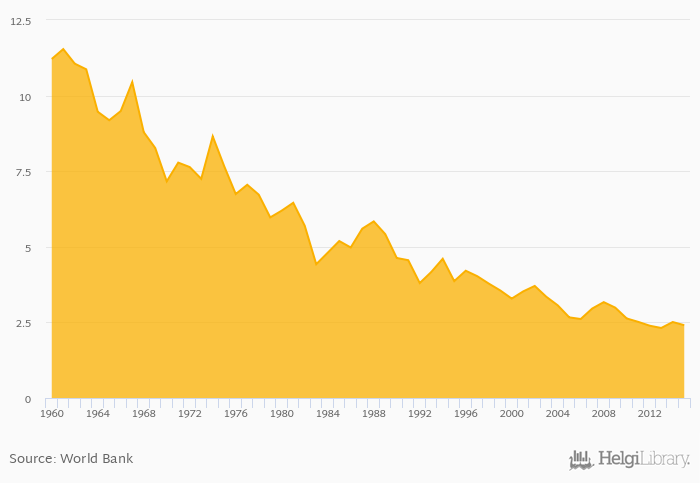 Value added of agriculture as a share of GDP fell 4.17% to 2.41% in South Africa in 2015, according to Faostat.