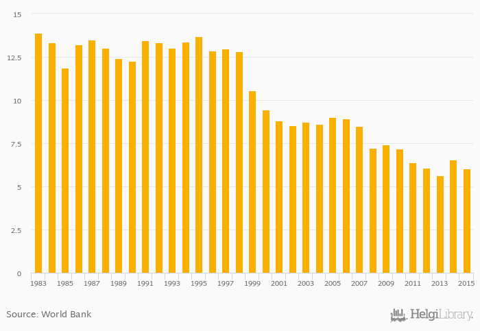 | Agriculture, Value Added (As % of GDP) | Unit | 1995 | 1996 | 1997 | 1998 | 1999 | 2000 | 2001 | 2002 | 2003 | 2004 | 2005 | 2006 | 2007 | 2008 | 2009 | 2010 | 2011 | 2012 | 2013 | 2014 | 2015 |