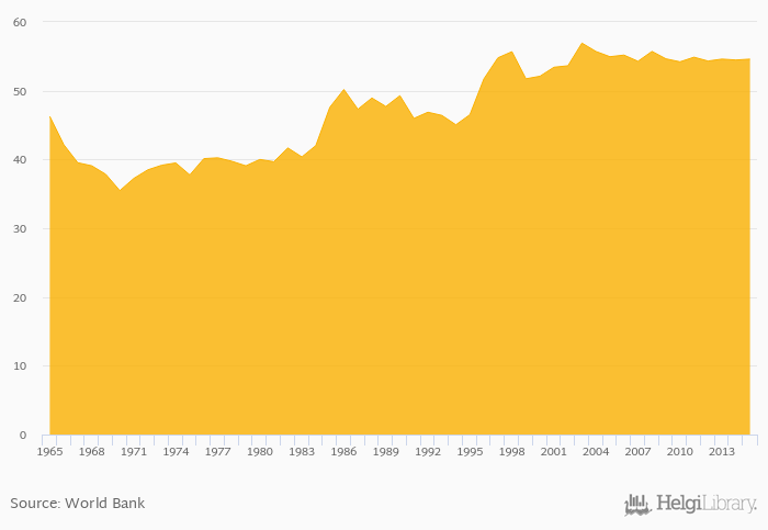 Value added of agriculture as a share of GDP rose 0.241% to 54.6% in Central African Republic in 2015, according to Faostat.
