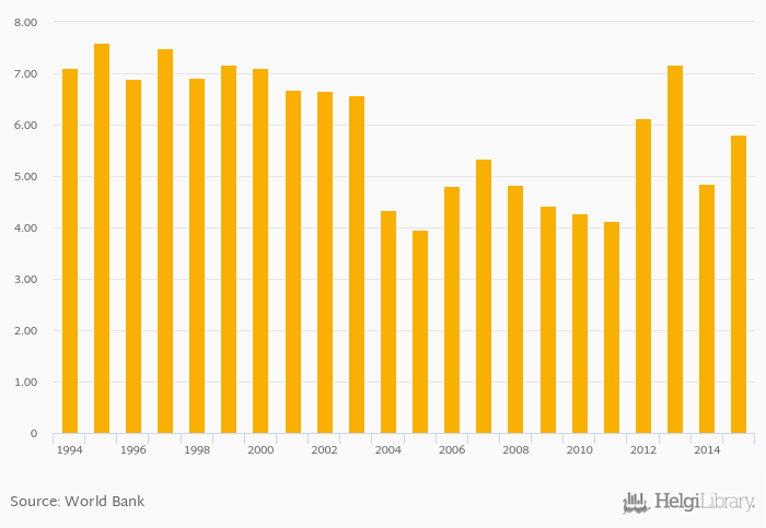 | Agriculture, Value Added (As % of GDP) | Unit | 1995 | 1996 | 1997 | 1998 | 1999 | 2000 | 2001 | 2002 | 2003 | 2004 | 2005 | 2006 | 2007 | 2008 | 2009 | 2010 | 2011 | 2012 | 2013 | 2014 | 2015 |