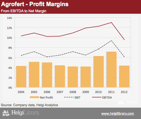 The profit margins remain stable at around 4% (in terms of net profit), 6% (on the EBIT level) and 10% in terms of EBITDA