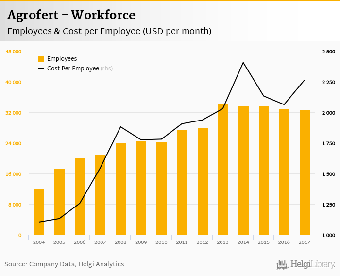 Agrofert employed 32,770 employees in 2017, down 0.586% compared to the previous year. Historically, between 2004 and 2017, the firm's workforce hit a high of 34,399 employees in 2013 and a low of 12,040 employees in 2004.