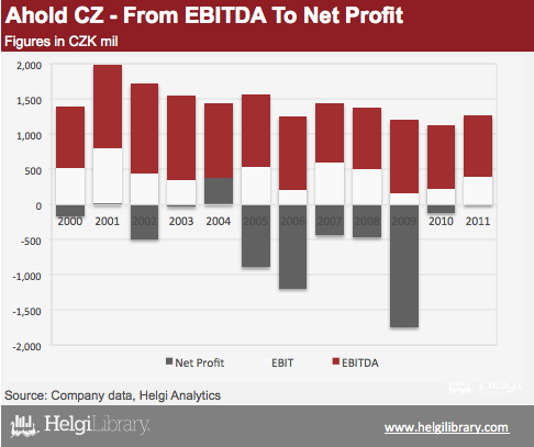 Sales of Ahold Česká republika exceeded CZK 40 bil again in 2011. This is 40% more than in 2002. When looking at the long-term profit development, however, Czech subsidiary is clearly not the entity where profits are booked. A loss of nearly CZK 5 bil has been booked in 2005-2011.
