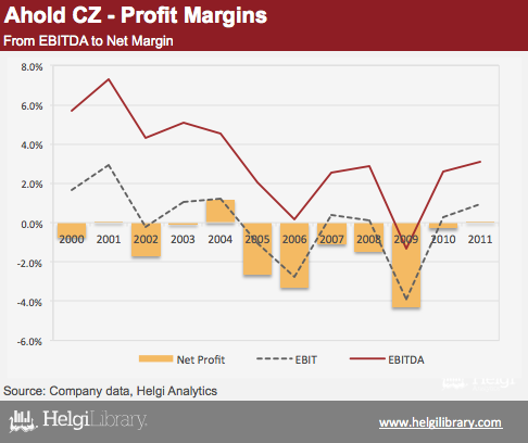 Sales of Ahold Česká republika exceeded CZK 40 bil again in 2011. This is 40% more than in 2002. When looking at the long-term profit development, however, Czech subsidiary is clearly not the entity where profits are booked. A loss of nearly CZK 5 bil has been booked in 2005-2011.