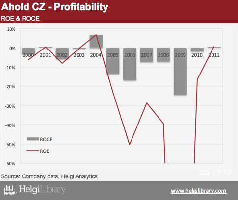 Sales of Ahold Česká republika exceeded CZK 40 bil again in 2011. This is 40% more than in 2002. When looking at the long-term profit development, however, Czech subsidiary is clearly not the entity where profits are booked. A loss of nearly CZK 5 bil has been booked in 2005-2011.