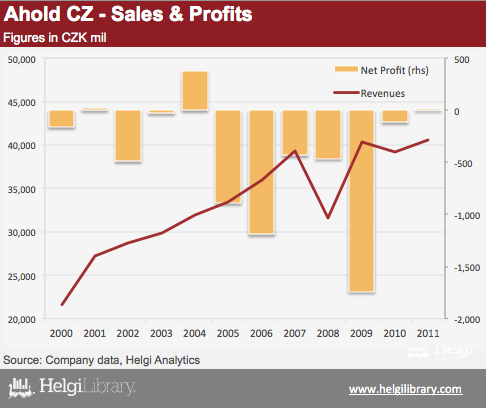 Sales of Ahold Česká republika exceeded CZK 40 bil again in 2011. This is 40% more than in 2002. When looking at the long-term profit development, however, Czech subsidiary is clearly not the entity where profits are booked. A loss of nearly CZK 5 bil has been booked in 2005-2011.