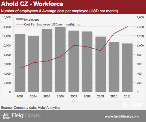 Ahold employed 10,371 persons in the Czech Republic in 2011. That is 16% fewer than in 2003. On the other hand, average personnel cost increased by 176% to nearly USD 1,400 per employee in between 2003-2011.