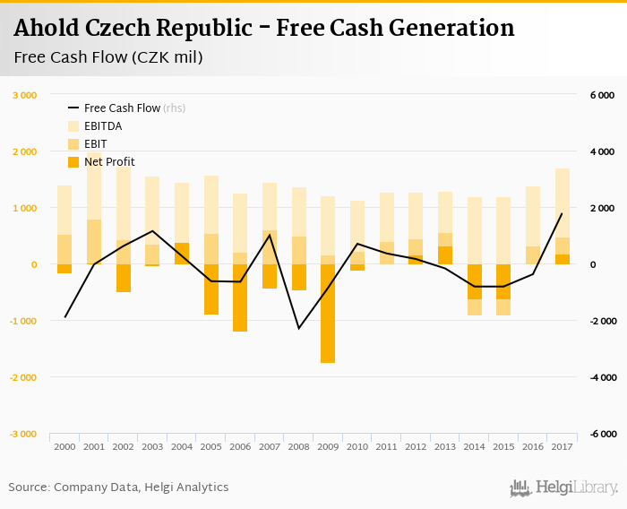 The company generated cash, defined by a sum of net profit and depreciation, of CZK 1,394 mil or 2.80% of sales. When investments are excluded, free cash flow reached CZK 1,785 mil, or 3.59% of sales in 2017.