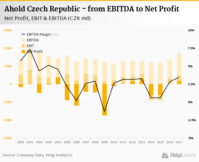 Ahold Czech Republic made a net profit of CZK 170 mil with revenues of CZK 49,765 mil in 2017, up by 4% and up by 0.291%, respectively, compared to the previous year. This translates into a net margin of 0.341%.
