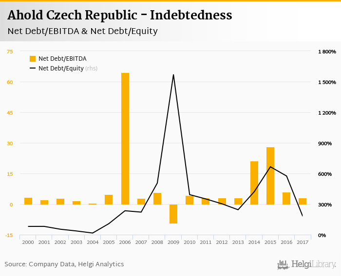 Ahold Czech Republic's net debt stood at CZK 5,202 mil and accounted for 181% of equity at the end of 2017. The ratio is down 395 pp compared to the previous year.