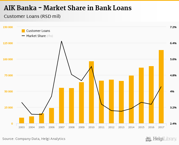 AIK Banka accounted for 4.23% of all customer loans issued in Serbia at the end of 2017. Historically, the bank’s market share in customer loans reached an all time high of 6.49% in 2007 and an all time low of 2.84% in 2005.