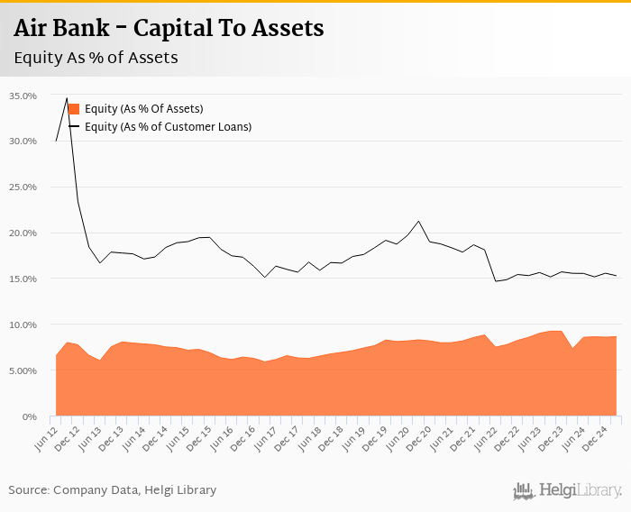 Air Bank's Equity reached 8.60% of total assets in the 1Q2025, up from 7.29% for the previous year. As a share of net customer loans, the ratio amounted to 15.2% at the end of the first quarter of 2025.