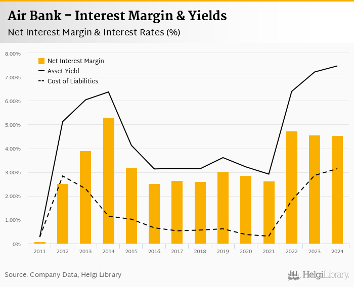 Comparing Air Bank with its closest peers, Ceska Sporitelna operated in 2024 with a net interest margin of 2.08% in 2024, CSOB reached 1.66% and Komercni Banka some 1.66%.