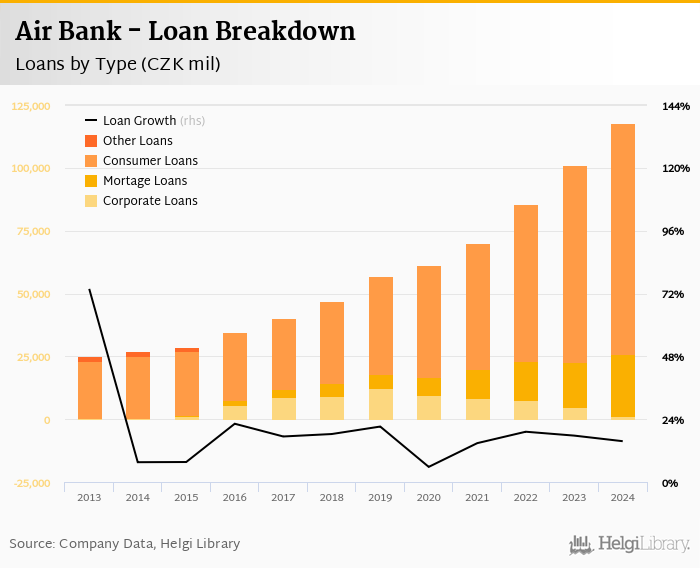 At the end of 2024, Air Bank's loans accounted for 64.5% of total deposits and 55.2% of total assets.