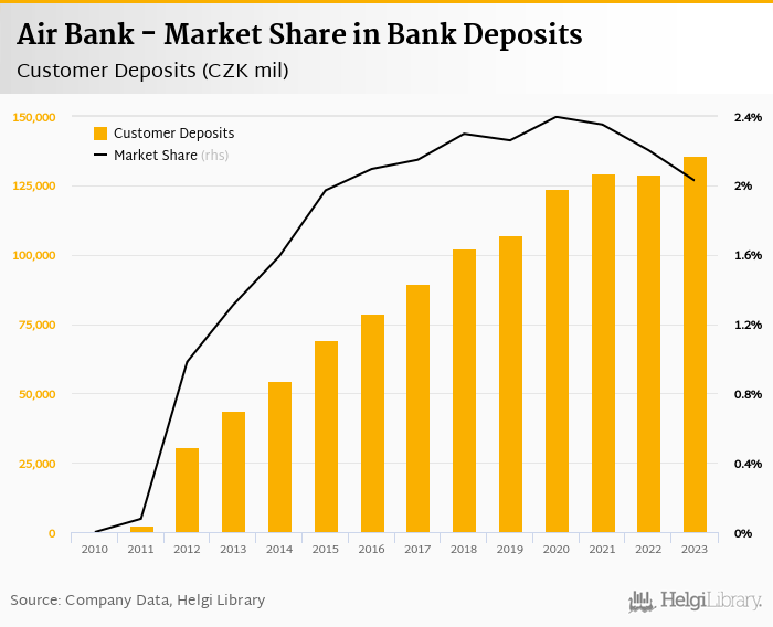 Air Bank accounted for 2.03% of all customer deposits taken by banks in Czechia at the end of 2023. Historically, the bank’s market share in customer deposits reached an all time high of 2.39% in 2020 and an all time low of 0% in 2010.